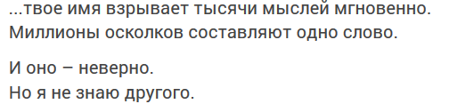 Если я все верно поняла, то героиня еще не отошла от какой-то ситуации. От разрыва отношений или еще чего. Герои не вместе. Но эмоции очень сильные (обоюдные или нет, не понятно). Даже его имя - взрыв внутри. Осколки составляют одно слово – любовь. И оно – неверное. Возможно, так и есть. Возможно, лучше подойдет страсть. И героиня это подозревает. Но для нее других слов нет. Только то, которое неверно.