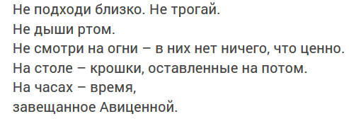 Очень много всяких «не». Много выстроенных запретов. Опять не могу понять, кто тут адресат. Т. е. вполне возможно, что все эти «не» относятся к тому, кто говорит. Т. е. запреты для себя.