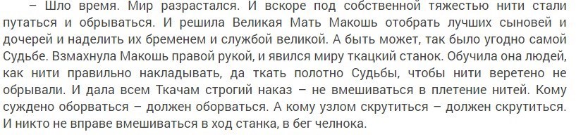 Я, к сожалению, в мифологии и сказках не сильна. Даже определение не знаю, чем одно от другого отличается. Посему роман читала, что называется, с чистым восприятием – понятия не имея, существуют ли у каких-то народов легенды о Полотне Судьбы, Ткачах, Жнецах, или же все это создано авторским воображением. То есть, я знаю про мойр и пряжу; про Бабу Ягу и домовых в детстве слышала; примерно тогда же читала бажовские сказки – но не более. Так сказать, стандартный набор. И авторский мир, ключевое слово которого «Судьба» - именно так, с большой буквы - мне понравился.