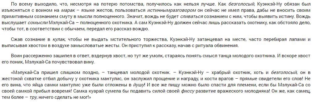Терминология. Все эти Таос, эффа, рэкку. Тоже немаловажный, но часто упускаемые момент. У оригинальных существ должна быть, по умолчанию (!) оригинальная терминология заточенная под их мир и их социум. (Это как про чукчей у которых существует несколько десятков слов для обозначения снега в разных состояниях).