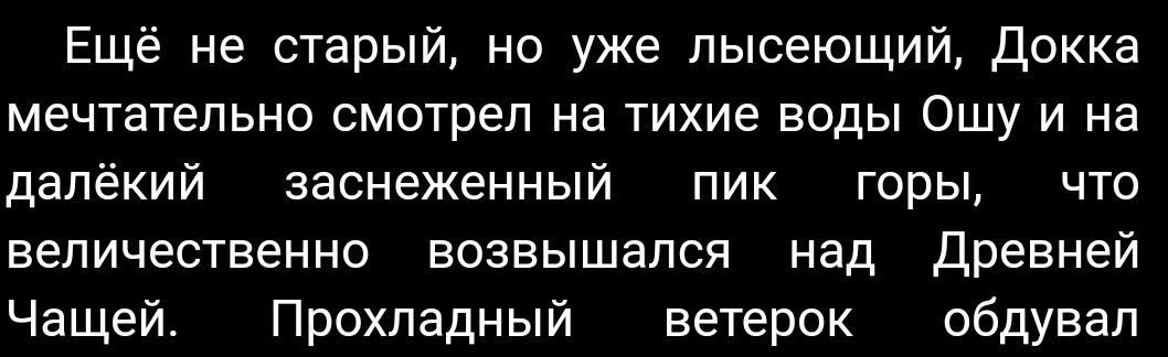 Думаю, стоит отметить персонажей повести. Они яркие, харизматичные и запоминающиеся. У каждого из них своя особенность, отличающая от других героев и позволяющая узнать их без «маркеров». Так, например, Докка часто использует в речи «ага-ага». Эта особенность позволяет понять, что реплика принадлежит ему. С персонажами приятно знакомиться, узнавать, как они относятся к жизни. Думаю, мудрые и мыслящие герои одно из главных преимуществ повести. В репликах персонажей собраны простые, но тонкие не очевидные, понятные скорее на душевном уровне мысли. Каждый герой – луч света и надежды, способный разжечь нечто таинственное в сердце. Также хочется отметить, что портреты героев впечатываются в воображение. Автор прописывает образы, давая интересные, красочные описания: «Еще не старый, но уже лысеющий, Докка мечтательно смотрел на тихие воды Ошу и на далекий заснеженный пик горы, что величественно возвышался над Древней Чащей».
