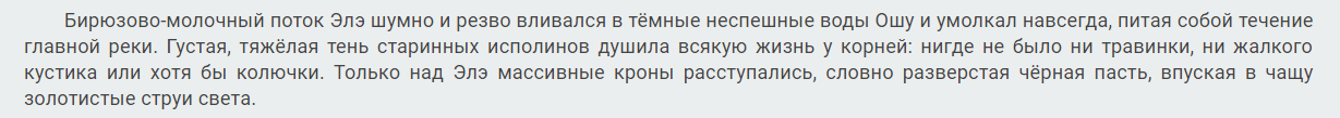 Текст льется рекой, журчит ручьем, искрится как солнечные блики. Темпоритм завораживает. Ненавязчивым фоном слышится музыка. Попытаюсь передать собственные ощущения. Звенящие звуки скрипки, нежные флейты, тревожные барабан и бас гитара. Торжественно как орган. И что-то неуловимо северное, может быть варган. Да. Определенно варган.