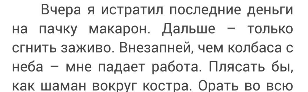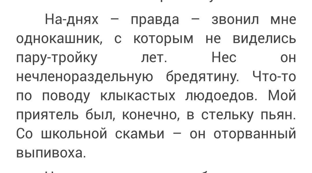 Стиль специфичен. Это наплыв коротких обрывистых предложений, преимущественно в настоящем времени, словно герой телеграфирует или пишет смски с места действия, создавая своеобразный репортаж, что там происходит здесь и сейчас. Втянуться в чтение было бы легко. Если бы не тире. Они везде. Зачастую вне правил пунктуации. Я честно решила, что они интонационные, и попыталась прочитать отрывок, делая там, где стоят тире, паузы. Ну, если только герой произносит весь свой монолог, тормозя через слово и задыхаясь...