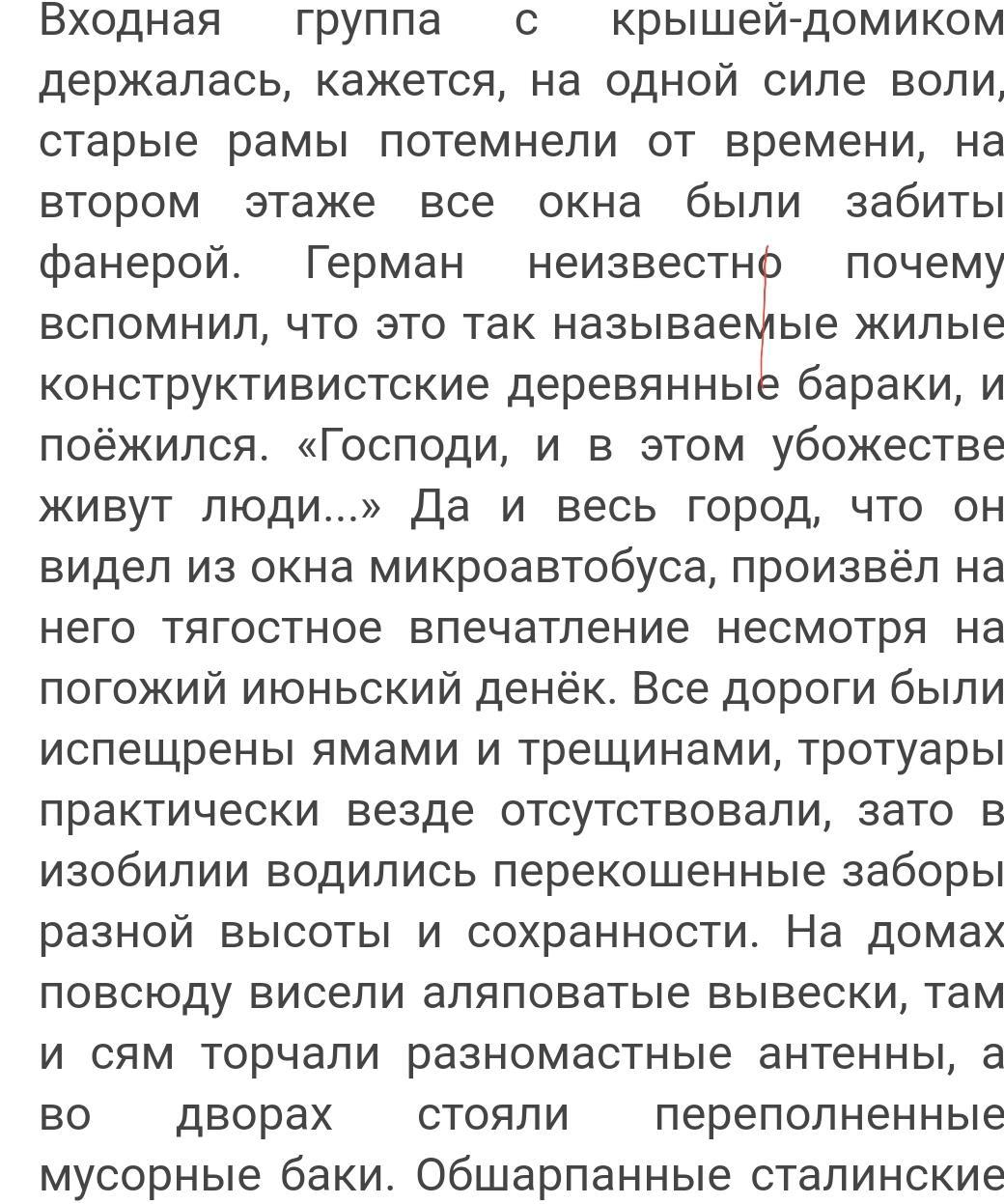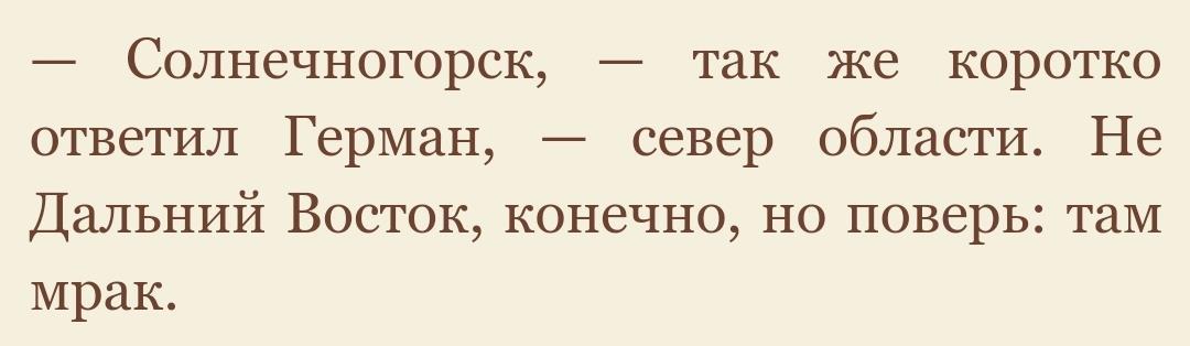 Жаль, что нельзя копировать обрывки текста (хотя можно и скриншотить), но прочитав первые главы вы узнаете кучу ненужной информации (если только вы не хотите посетить Солнечногорск), о структуре города и отношению автора к местному колориту и лишь мизерную информацию о сути квартиры на Крупской. Впрочем, продолжив читать дальше, вы узнаете о том, как немецкий репортер русского происхождения пытается понравится солнечногорской журналистке, которая пытается понравится ему. Этим отношениям посвещена уйма времени, а загадочное расследование? Это так фон, способ для создания еще одной ячейки общества.