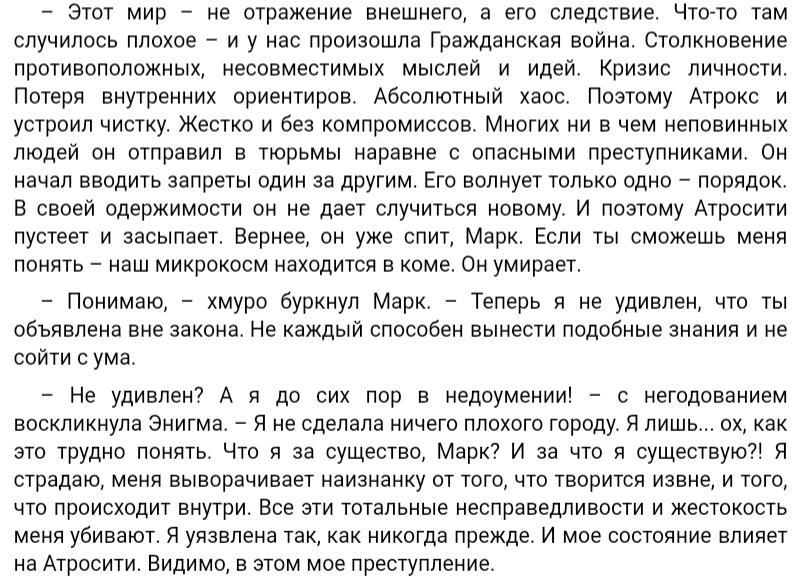 Сразу привлекает внимание, не так ли? По-моему, Энигма - самый необычный и интересный персонаж книги. От нее мы как раз и слышим гипотезу, объясняющую причины того, что творится в Атросити, а также в чем она себя считает виновной.