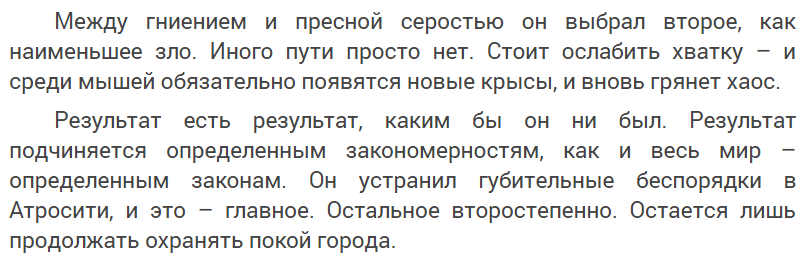 Если бы план работал без отклонений, Атросити представлял бы собой некий абсурдный "город счастливых роботов": всё строго упорядочено и унифицировано, вокруг - рай урбаниста без единого клочка природы, а в магазинах - искусственная еда. Есть чёткая система запретов и санкций, вложенная в программу "внутреннего контура безопасности" (на этот счёт в одном месте встретилось необычное для меня словосочетание "полицейских солдат"). И даже сами люди, казалось бы, приняли всё это и приспособились к новым условиям, немного отдающим каким-то реалРПГ (и только главные герои будто кучка ненормальных, бросающих этому порядку вызов).
