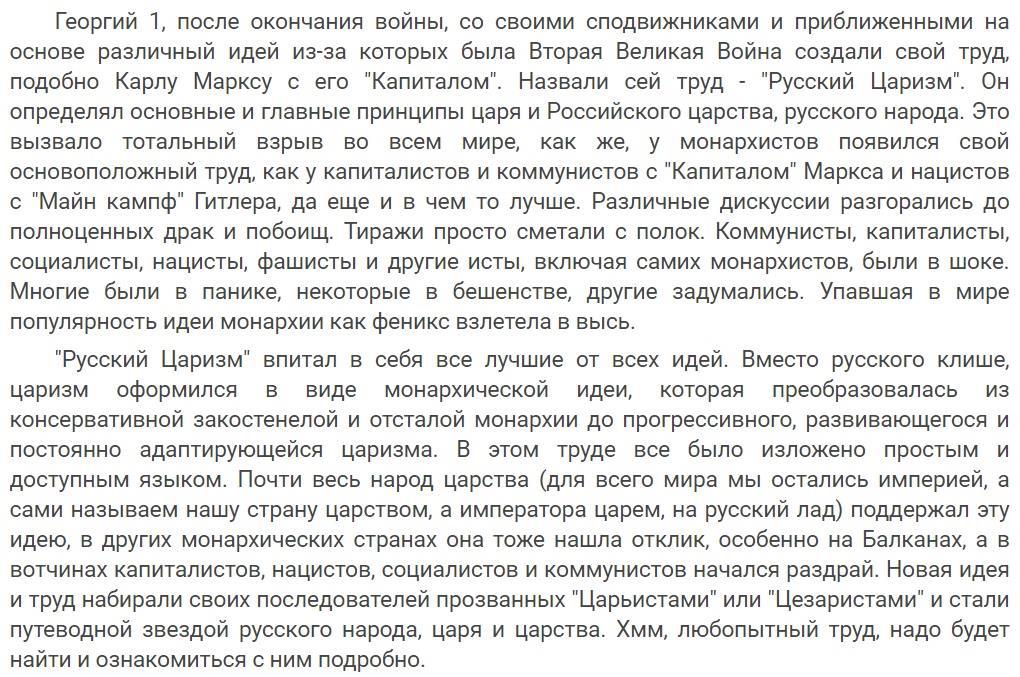 В той же второй главе есть куча совершенно ненужного текста про государственное устройство – оно не фигурирует больше нигде и в целом не несет никакого смысла ни со стороны важности для фика ни как отдельная система. Оно упоротое от начала и до конца, его даже сколь-нибудь всерьез невозможно воспринимать, это набор бессвязных слов и предложений. Если попытаться всю эту лабуду структурировать, то не получится ничего, в ней отсутствует рациональное зерно, отсутствует элементарный смысл. Есть просто набор из слов «армия», «экономика», «реформы», их синонимов и кучи дореволюционных наименований должностей. Автор не задумывается, как оно вообще будет работать, не углубляется в тему, чтобы понять хоть примерно, как это может быть. Ему некогда, он просто строчит и строчит нечто упоротое, напоминающее бездумно вырванные из контекста кусочки школьного учебника по истории, и вставленные в какую-то отсебятину из безумных фантазий. Описанное устройство Российской империи начиная с XXI века отдаленно напоминают некую дико упоротую автаркию – по изложенной в тесте мысли автора, добытые ресурсы очень выгодно складывать на складах и побольше, побольше. Продавать их за рубеж невыгодно, и этого не делают. Вот такая вот успешная экономика.