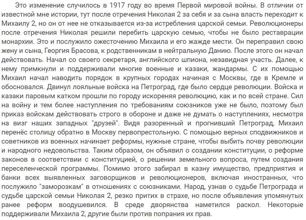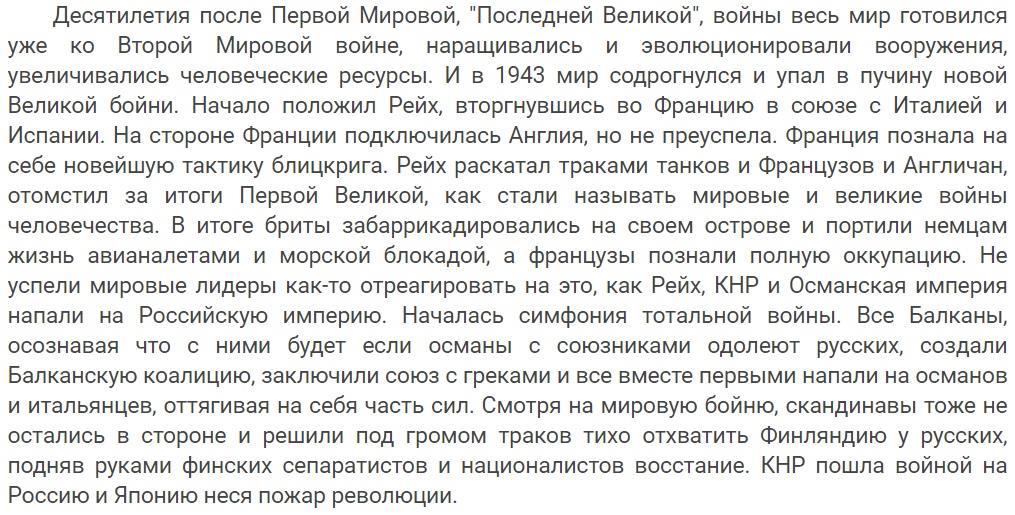 После этого демарша Первая мировая волшебным образом закончилась с толком даже непонятно каким итогом, но Россия вернула часть территорий занятых немцами. А затем ее принялись реформировать: для начала ввели всеобщую воинскую повинность… Э-э-э, так, подождите, а раньше какая была, с 1874 года? Ну да ладно, похоже, автора такие вопросы вообще не смущают. Дальше там, в общем, была индустриализация и урбанизация. И счастье народное. Сразу как у Японии станки закупили – так и наступил прорыв в промышленности. Серьезно. Россия в этой реальности в 20-30-х закупала оборудование у Японии. Видимо, автор знает, что это сейчас страна хайтека, но про ее состояние в те времена прочитать не удосужился.