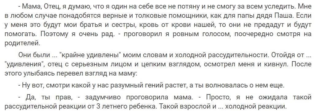 «Разумный гений», да. Тут бы им охренеть как охренеет любой нормальный человек, когда трехлетний ребенок начинает такие тирады выдавать, слегка удивились. Объясняется такое странное поведение окружающих тем, что его новое тело не только права на престол имеет, но еще и генетически модифицированное, поэтому он ну прям вообще сверхразумным гением должен получиться. Но по факту, из того что нам видно - вышла макака-анацефал с безумным плот армором, тщательно ведомая авторской волей, и ею же щедро осыпаемая подарками.
