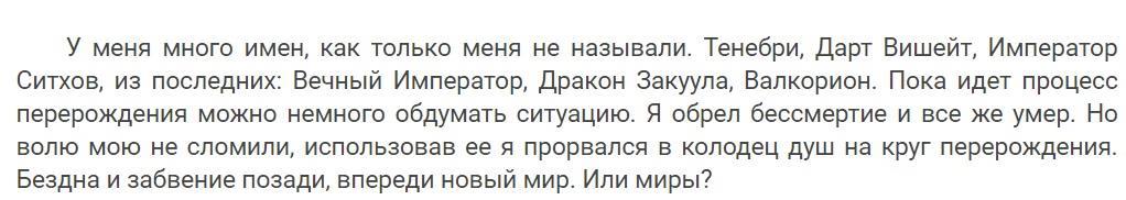 Но наш герой скромняга, поэтому ограничился только несколькими именами и прозвищами. Если вы не знаете, откуда они, то не беда, я вам скажу: из Звездных Войн. И уверяю, не стоит переживать насчет своего незнания, не нужно гуглить, кто это все такие, если конечно, самому не интересно. Это просто пафосные слова, за которыми нет ничего, так как к вышеназванным именам этот персонаж имеет примерно такое же отношение, как школьник, подписавшийся в какой-то игрульке именем любимого героя из анимешки к этому самому герою. То есть – никакого. Ну кроме того что ГГ изредка изрыгает на читателя куски пафоса.