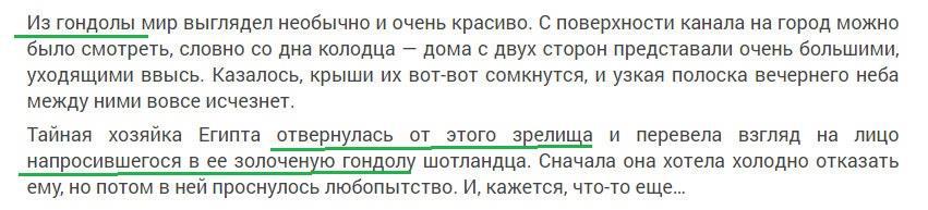 Вот мы едем в гондоле... Из прошлой главы помним, что тайная хозяйка Египта позвала к себе шотландца (заместительные я тоже не люблю, но тут они демонстрируют якобы анонимность героев, так что лана).