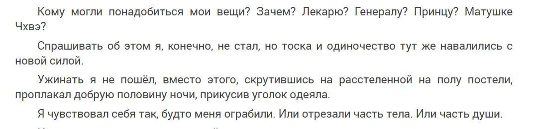 Сюжет развивается неспешно. В первой половине текста хотелось бы больше действий и меньше бытовых подробностей. Главгер всё время плачет, хочет домой, опять плачет, ест, моется, толчёт коренья, вышивает, переживает по поводу одежды и того, что его крашеные волосы уже заметно отросли. Вместо сочувствия он временами вызывает желание его слегка прибить, вот, например, после такого: