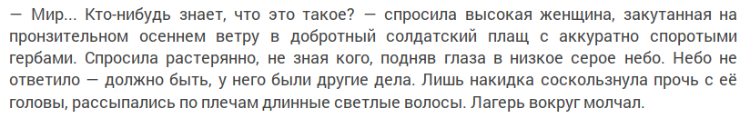 И читатель вполне может вздрогнуть. Хотя далее, а я прочитал до самого конца, подобного безобразия нет. Меня лично царапали лишь отсылочки. Причём вплетены они вполне уместно, то есть, если не знать первоисточник, то фраза и фраза — вполне уместная, но вот если знать...