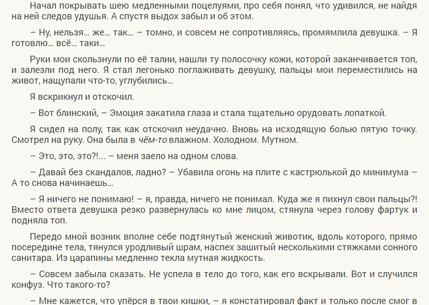 Всё вышеизложенное, по моим ощущениям, должно было стать завязкой, но стало только первой третью всей истории. Вот в чём мне видится единственный минус: у повести размазало композицию. Мы обстоятельно въезжали в мир героя, вникали в тонкости работы мальчиком-на-дегустации, сходили вместе с ним на неудачное рандеву... Всё для того, чтобы затем спешно пробежаться по собственно идее.