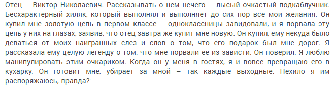 Итак, на первый взгляд ГГ (Ада — какое говорящее имя!) — социопат. И это я не опечатался в слове социофоб три раза, как сейчас принято делать, а веду речь о личности патологически бесчувственной, неспособной испытывать вину и понимать общественные нормы, хотя она умело маскируется под «нормальную». Героиня талантливо и хладнокровно манипулирует своим окружением, которое для неё — стадо и мясо. Встретив кого-нибудь, Ада мысленно даёт ему мерзкую характеристику (вроде «кусок мяса сорокалетней давности»). Да к чему лишние слова, посмотрите, как она говорит о собственном отце: