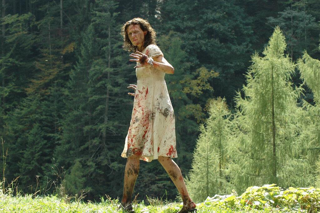 «Фелла брела по дороге к ним. Сперва показалось, что на ней платье из красного шелка — яркое и блестящее, но потом стало ясно, что это кровь».