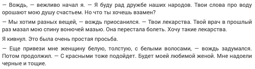 Очень классно и просто описаны разные культуры и разные мировоззрения. Без простыней текста, в делах и словах. Вот так, например: