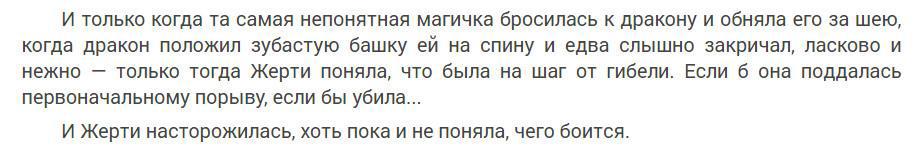 Поскольку Костик тут поставлен во главу угла, так сказать, всех событий, о нем подробнее. То, как описаны его переживания в теле юного дракона, борьба чудовищного и человеческого - снимаю шляпу! Иногда у меня даже мелькало сомнение, что на такие подвиги человечности способен мальчишка-пятиклассник. Эволюция дракона показана тоже - высший класс. Хотя его первая охота заставила меня хохотать. Летал, увидел внизу оленей, стал снижаться, упал - пришиб собой оленя. :) Молодец! А уж дальше все пошло само собой. Насколько я понимаю, во время охоты драконье все же перевешивало человеческое, потому что для мальчишки убивать животных, теплокровных, тоже должно быть нелегко. Но автор решил на этом не заостряться, и молодец. А как описаны ощущения летящего дракона в небе, когда он искал Магическую академию! Я сама мысленно стала драконом и мне не хотелось спускаться!