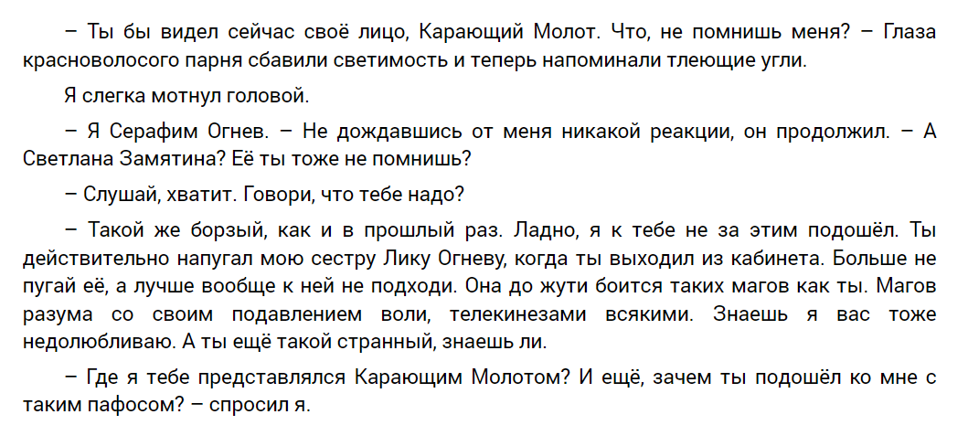 Затем попуданец приходит в столовку на званый ужин. Ужин правда так себе, но и у нас тут путяга на рабочей окраине. Гг сразу нарывается на конфликт, какому-то Ветрову не нравится, что герой сел за стол для блатных. Зачем Ветров ведет себя как быдло, тралирует и называет ГГ простолюдином? С человеческой точки зрения мне не понять, вроде взрослый человек и хоть какой-то интеллектуальный ценз при поступление проходил, а ведет себя как угашенный спайсухой неандерталец окраин. С точки же зрения сюжета - все очень просто, герой давно никого не нагибал, так что нужен картонный болванчик для показательного черенкования. Ну никто ж не будет прописывать в бояру достоверных антагонистов и думать от их лица. Ведь прода должна литься потоком стекломоя в боярские глаза, а любое промедление - смерти подобно. Ветрова показательно избивают на магической дуэли. Теперь ГГ враждует со всем его родом. Зачем враждуют? Непонятно. Зачем Ветровы с ним враждуют? Ну чтоб плоский конфликт был.