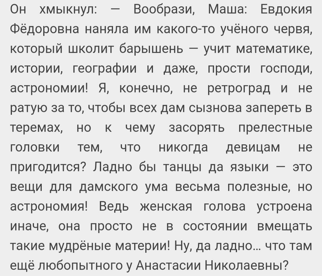 Изрядная доля повествования уделена романтическим отношениям молодых людей, но я точно могу сказать, что это не любовный роман! На ум приходит «Граф Монте-Кристо» — ведь там любовь тоже играет огромную роль для сюжета, но книга от этого любовным романом не становится. В книге «Грехи отцов» отношения служат индикатором взросления. Особенно это заметно на примере Владимира, третьего молодого человека, который остаётся в тени Алексея и Филиппа, но интересна его внезапная (и для него самого) привязанность к девушке из низшего сословия.