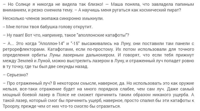 Книжка написана, прямо скажем, плохо, но самое смешное в том, что невозможно сказать, будто автор не умеет писать хорошо. Ещё как умеет! И детали тут есть замечательные, и диалоги живые (когда бортмеханик отчитывается, что "потроха зелёные", это прекрасно и жизненно). И даже объяснялки, оказывается, можно давать так, что от них не тошнит: