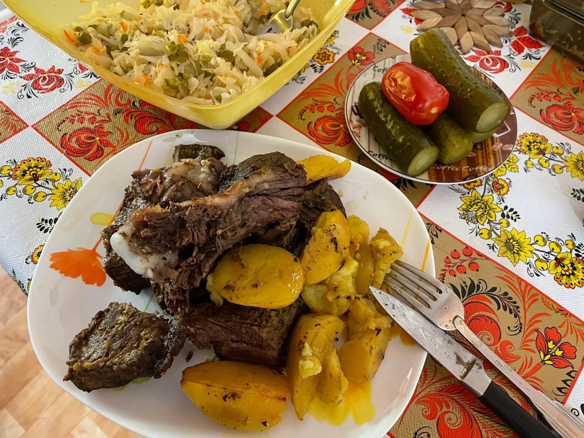 Вот чем кормили нашу Сашеньку. Это запечённая или лосятина, или козлятина. Сам-то я не в курсе. Квашенная капуста и маринованные огурчики. И всё так великолепно сохранилось! Какие всё-таки передовые технологии на Дзиньблинфигваме.