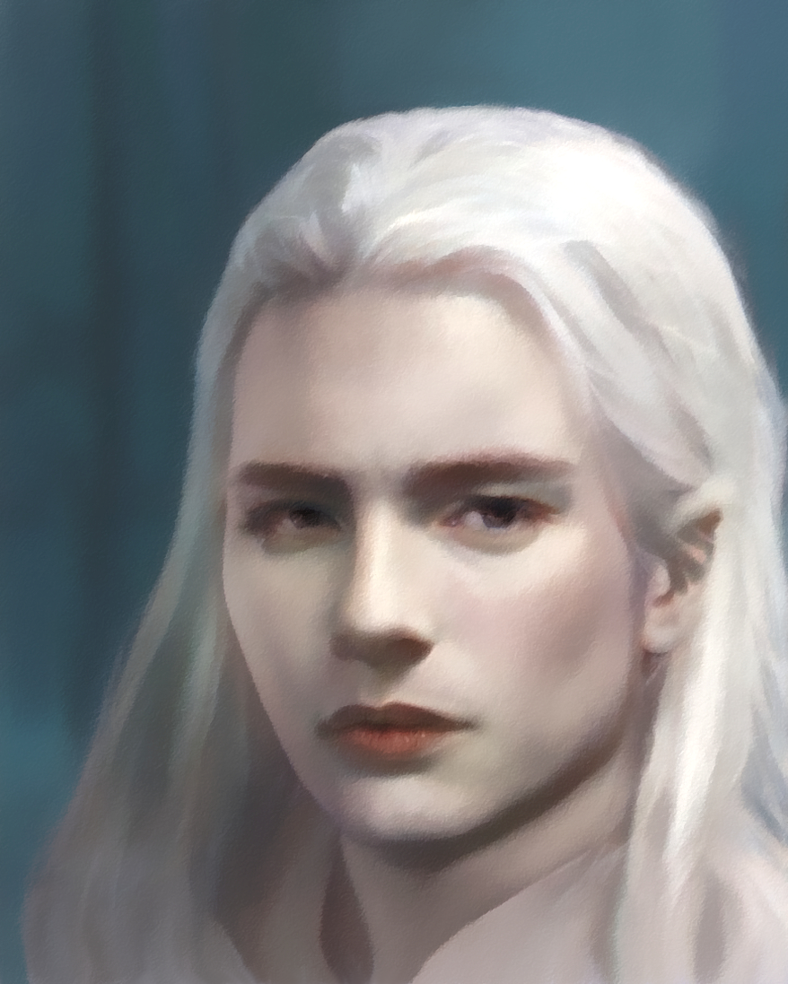 Он, вроде бы, отлично устроился при том, что не родился с серебряной ложечкой во рту. Он решителен и безжалостен. У него все зашибись, если не знать некоторых деталей его биографии и некоторых условий его существования. Если знать бэкграунд, то его статус и власть -- так себе достижение, по здравом размышлении себе такой судьбы не пожелаешь. У подданных он вызывает страх, у читателя... пожалуй, сочувствие. Покачав головой и подумав: "Надо же, как влип, чудак!" -- я нарисовала его портрет. Как, пожалуй, самого человечного из прочитанных. Несмотря на то, что сам он уже почти и не человек:
