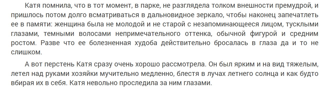 А главным отрицательным персонажем для меня стала Ворона — маленькая и худая женщина, ничем особенным не выделяющаяся, также из премудрых и умеющая превращаться в ворону. Но на ряду с этим очень жестокая, злопамятная, завистливая. Не считается с последствиями своих действий не только для себя, но и для других.