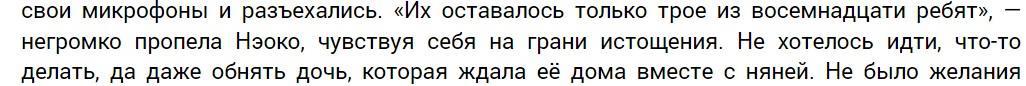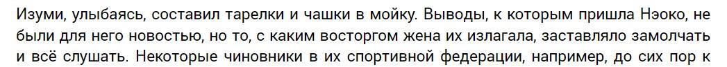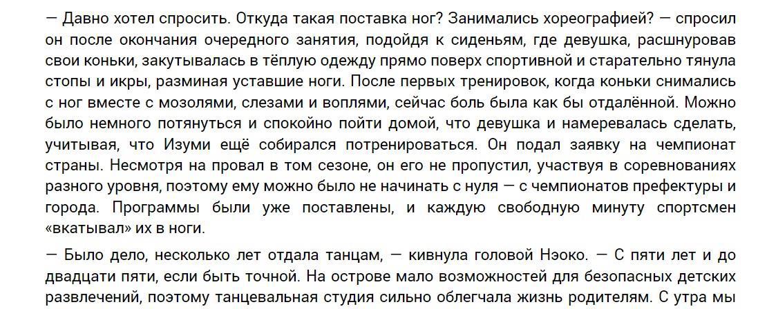 По части логики тоже не всё гладко. Вот Нэоко впервые оказывается на льду вместе со знаменитым фигуристом, к тому же, молодым и красивым. Казалось бы, она должна испытывать волнение, ощущение счастья... Но нет. Героиня размышляет почему-то в это время о своей жизни без отца, поступлении в университет и прочей бытовухе.