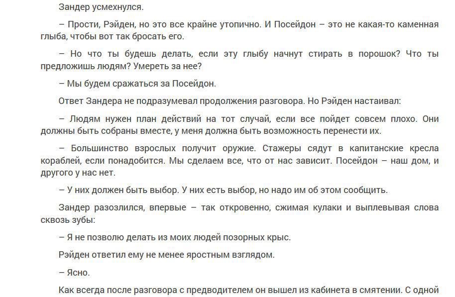 Что я вижу я этом принтскрине? Чувства героев даются декларативно в атрибуции, но никак не проявляются в самих репликах. Убрать «яростные взгляды и сквозьзубы» и будет довольно вялый обмен бесцветными общими фразами. И как на самом деле собираются защищать Посейдон, если убрать ура-патриотические прокламации? Система обороны тоже на вибриссах кошки Муси? Мне вот мало узнать, что взрослые получат некое оружие, а какие-то там стажеры рассядутся по креслам невесть откель взятых невесть каких кораблей. И что? То есть куча вообщешных схематических слов, никакой конкретики, придумай себе сам план защиты.