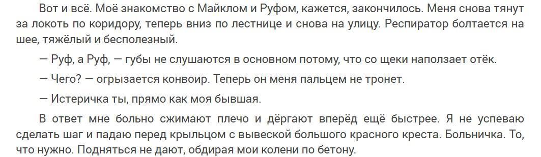 Мне очень понравился стиль автора — лаконичный, выразительный, без лишних описаний, но дающий яркие и убедительные картины жизни в вырождающемся мегаполисе с отравленным воздухом, выжженной землёй и тотальной слежкой за людьми, основная масса которых предпочитает плыть по течению, и лишь немногие находят в себе силы бросить вызов Системе.