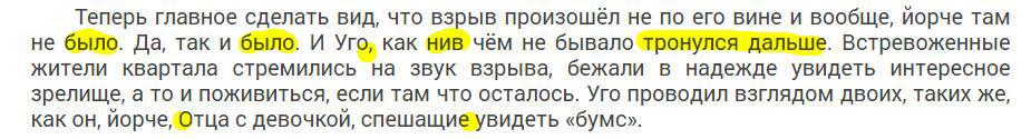 В общем, интереснейших замыслов много, фантазия буйная, респект! Но волны этой фантазии неслись так привольно, что за ними многое не поспевало. Описания часто смазаны, даны так, что картинка "не встает". Первые такие затыки у меня начались в особняке, куда залез для ограбления Уго, и продолжались практически до конца. Персонажи свистят мимо, как пули у виска. Особенно не хватало побольше насчет Фил, ведь именно ее заслуга, как я поняла, что Уго вырос таким... нестандартным. Не хватало упоминаний их совместного детства. Нагромождение событий и описаний часто выглядит, как зачин каких-то сюжетных линий (например, пребывание в поселке Йорче) - но они обрываются в никуда.