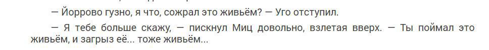 И напоследок. Миц. Один из двух главных персонажей. Его все время называют "приятелем", но я бы назвала по-другому: захребетник. В прямом смысле слова. Он все время висит на йорче - и в прямом и в переносном смысле - и возникает вопрос: а как выживают щурцы, которым не повезло найти того, на ком можно висеть? Уго к нему проникся чуть ли не отцовскими чувствами, а меня он сперва забавлял, потом озадачивал, потом начал дьявольски бесить. Мне бы хотелось посмотреть, как он выживает в городе, когда не на ком виснуть (у него уже скоро крылья отомрут за ненадобностью), некого описывать, некого объедать и не к кому все время взывать: "Уго, Уго!" КМК, он ловкий манипулятор. Вряд ли он таким задумывался, при помощи автора он совершил даже несколько самоотверженных поступков, но мне на таких захребетников слишком везет по жизни ("Я беспомощный, няшный, накорми меня, пожалей меня, посади меня на загривок" - ну, как кот в "Масяне"), чтобы я к нему прониклась теплыми чувствами.