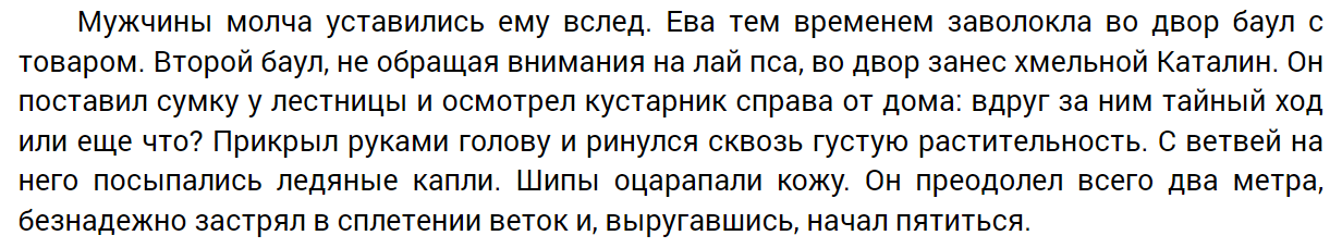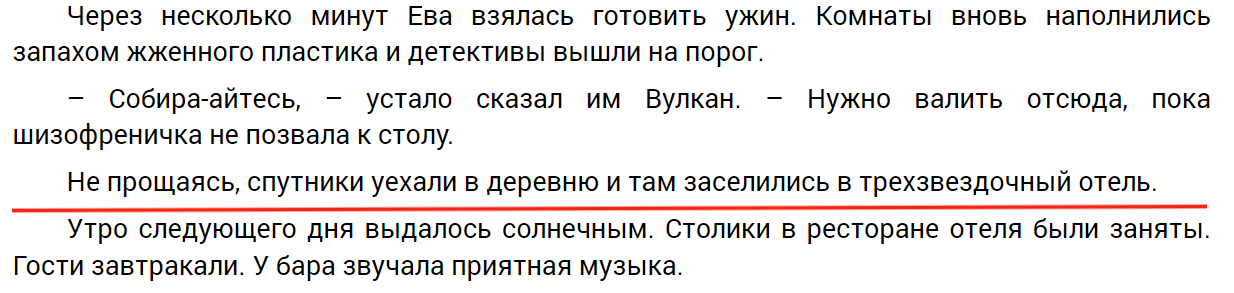Кто правильно воспримет подобный – без вставленного разделителя – текст?! События проносятся мимо, как «Сапсан», – ни черта разглядеть не успеваешь. Мне как читателю некомфортно.