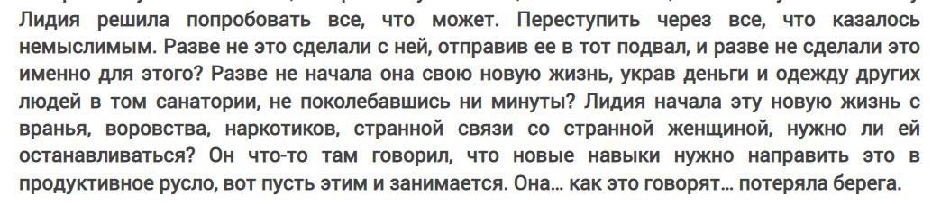 Лидия, она же Айша, она же Розамунда Перейра – личность очень интересная, но вынужденная постоянно расхлёбывать последствия психических и физических травм, которые получает в основном из-за Майки. Она любит «мутного типа» до такой степени, что прощает ему реально страшные поступки, но в то же время каким-то непостижимым образом влияет на него, меняя в лучшую сторону. Сама она при этом под его воздействием пробует чуть ли не все пороки по очереди: