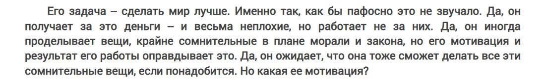 И идея сразу отзывается – делать мир лучше, это же классно! Другой вопрос, как это получается у героев на практике. Работа в больнице – да, польза её бесспорна. А вот что касается шпионской деятельности – здесь вопрос открытый, при этом совершенно ясно, что такие методы, как манипулирование, шантаж и особенно эксперименты, связанные с насилием над людьми, красоты и добра миру не добавляют.