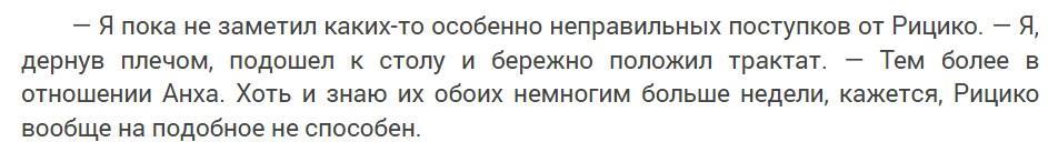 Что касается Тинэко – с моей точки зрения, у неё не было никаких доказательств виновности Найта, и она не должна была верить лживым словам Рицико. Могла бы попросить того же Шаана считать воспоминания Найта о событиях этого дня, например, но нет – надо было растоптать восьмилетнюю дружбу и обвинить человека в обмане, предательстве и страшном преступлении, которого он не совершал.