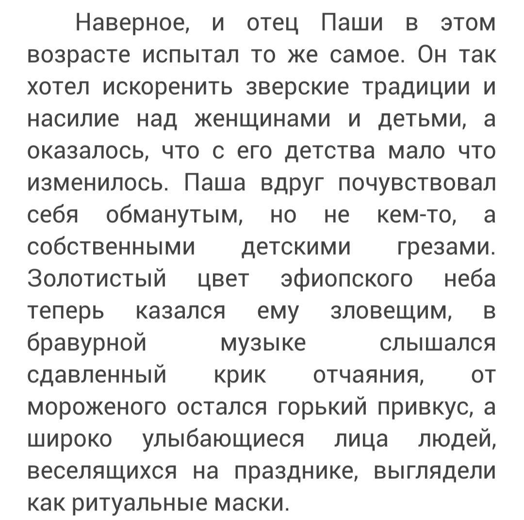 Ещё эта повесть о первой любви, которая в силу характера героя сразу становится чем-то действительно глубоким и серьезным. И о том, как может человек тосковать по родине на чужбине и одновременно тянуться к новому неизведанному миру. Знойное небо над головой, страшные обряды, тьма в представлениях местных жителей о жизни и загадочный дым, тянущийся из леса, добавляют повести невероятной атмосферы, нечто зловещее витает в воздухе, и при этом здесь есть место радостным прогулкам, ярким бусам, вкусному мороженому и веселым праздникам. Тяжелый труд и радость от простой жизни идут бок о бок. Африка подобна экзотическому животному - яркому, красивому и одновременно с этим опасному. Но, как я и писала выше, это произведение не только о жизни в Африке, оно о жизни и о людях в целом. Ведь неспроста герои в одном из своих разговоров говорят, что люди везде одинаковые.
