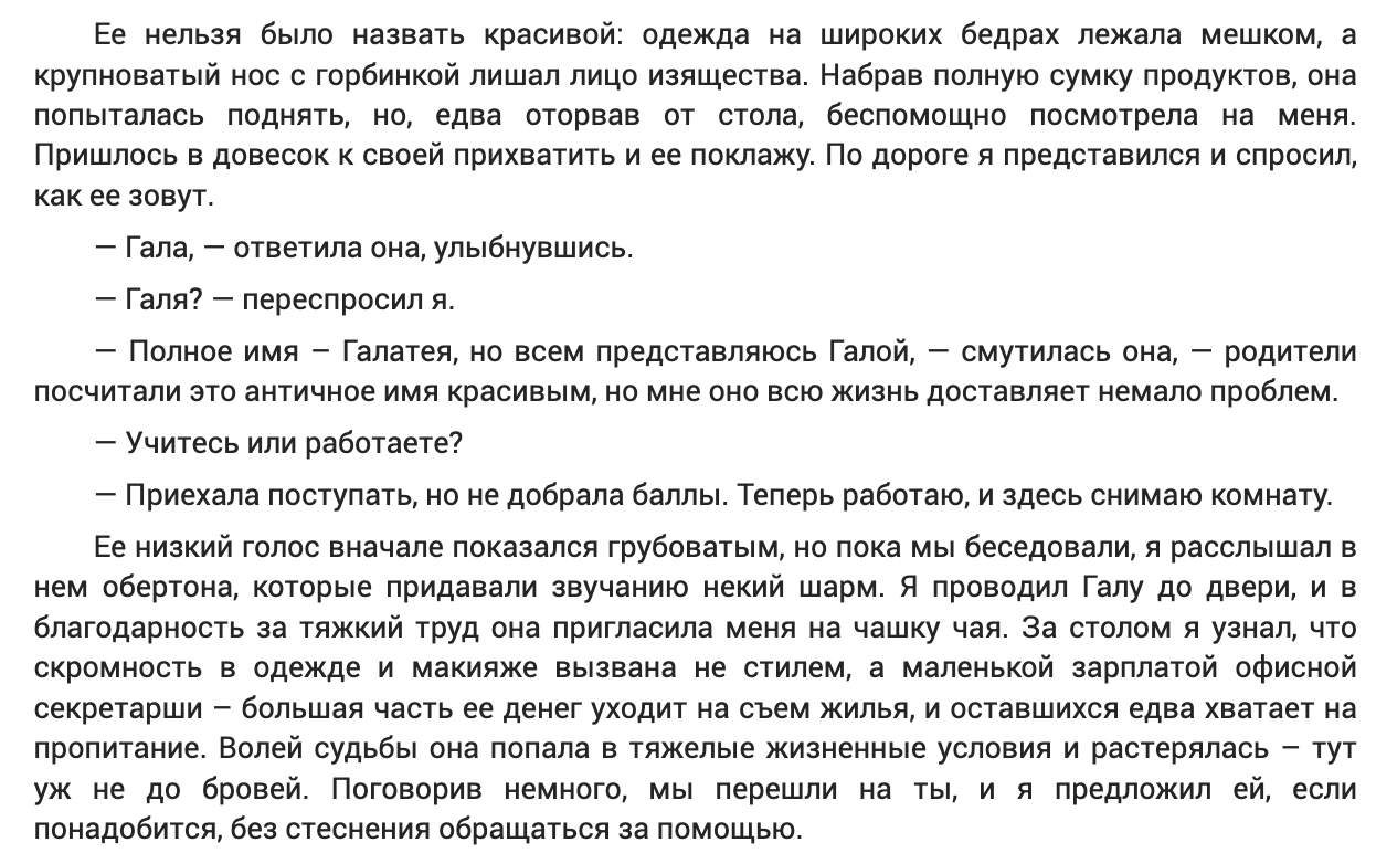Оно ровное, почти конспективное. Это, кстати, одна из больших бед повести: сюжету явно тесно в рамках 2.37 а.л., при должном усердии из заявленной темы можно сделать интересный роман о развитии и становлении личности. Увы, пока что этого нет, у меня сложилось стойкое впечатление, что пока я читаю некий черновик, набросок, уже не первый, но и не итоговый вариант. Художники же тоже перед написанием картины делают кучи этюдов и набросков, почему бы писателям не сделать то же самое, но всё же набросок всегда отличается от готового материала. Стиль без изысков, без каких-то запоминающихся описаний или диалогов, хотя несколько удачных находок я заскринила и покажу. В конце концов, то, что ГГ зовут Алексей, мы узнаём только в третьей главе! До этого Галатея (да, именно так и зовут девушку) с ним общается, ни разу не обратившись по имени. Вот такие мелочи и заставляют подумать, что перед нами ещё черновик, который будет редактироваться и дорабатываться.