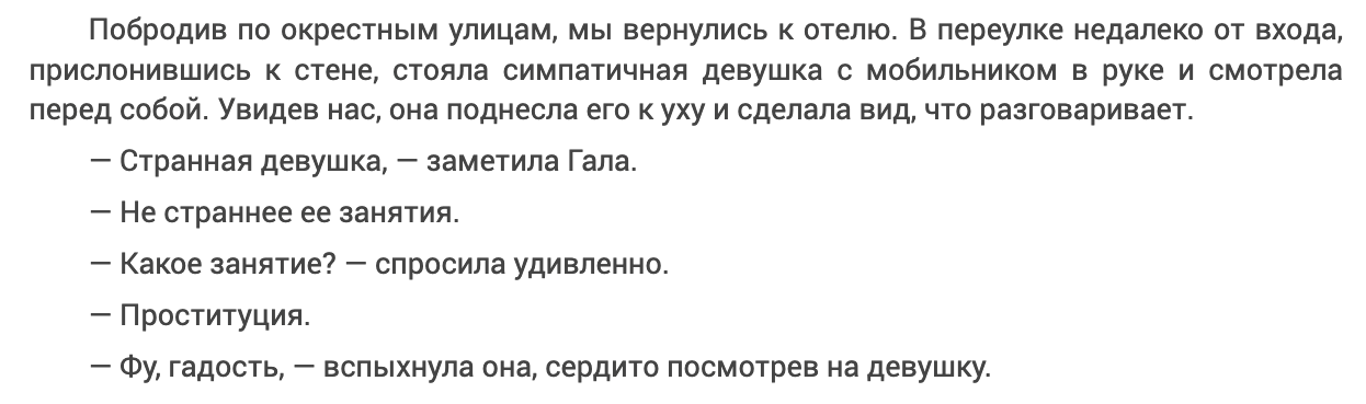 И такого много, в каждой главе по пачке. ГГ ведёт себя целомудренно-патерналистски, опекая Галу и продвигая её (кстати, откуда столько бабла на продвижение, если его фирма ютится в НИИ и не имеет даже секретарши?). Гала целомудренно-наивна до оторопи в свои девятнадцать, чего стоит её реакция на итальянскую проститутку: