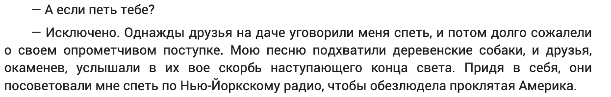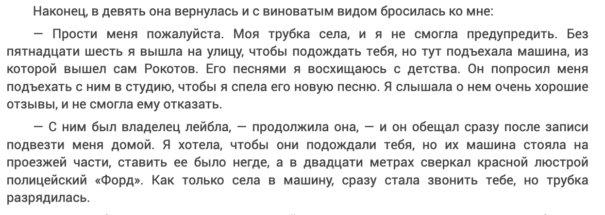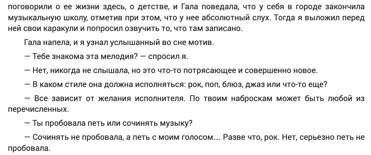 Или вот — Алексею снится сон, где Гала записывает нотами песню, которую она сочинила. Обладая хорошей памятью, утром Алексей копирует запомненные ноты, не понимая, что это вообще значит, а потом показывает девушке. Она говорит, что в своём городе закончила музыкальную школу и имеет абсолютный слух. И “с листа” напевает ноты, оказавшиеся красивой песней. Нет, простите, я не верю. Можно закончить музыкалку, но без постоянной практики ты не то что не напоёшь незнакомые ноты, а даже не сыграешь их ровно. Да, мне скажут, что это как велосипед, один раз научился и всё. Нифига. Если ты долго не ездил, то не сразу поедешь быстро и красиво. Если ты долго не играл, ты будешь вспоминать как минимум, как это делается, и даже абсолютный слух не панацея, когда ты давно не имел дело с нотами. Тем более, Гала работает секретаршей, совершенно не пересекаясь с музыкой. Так что я скорее поверю в волшебный сон, подсказавший ГГ вектор развития, чем в пение “с листа”, при условии, что ГГ записал ноты не как музыкант, а просто по-обезьяньи скопировал приснившиеся значки.