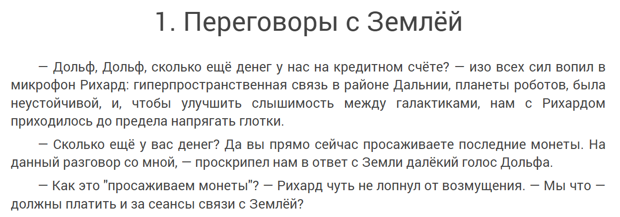 Заметна – особенно вначале – ориентация на западную фантастику. И здесь не только Лем, также американцы: Шекли, Саймак – кто еще? Я не являюсь глубоким специалистом по зарубежной фантастике, но чужеродный налет на губах ощущаю. С моей точки зрения, литературщина – это плохо. К концу повести она рассасывается, но не полностью. Что стоило заставить главных героев разговаривать как русские парни, а не американцы в плохом переводе?! Оно бы более жизненно получилось.