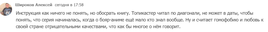 Не думаю, что первый том начал писаться раньше Бояръ-Аниме Метельского или Демченко. Да и не суть. Основной посыл в том, что в цикле много воды, скуки, нелогичных противоречий и повторений с переливанием из пустого в порожнее. Дело не в гомофобии персонажей, а в том, что будто больше просто не о чём писать. Снова и снова персонажи упоминают их, что начинает смахивать не на фобию, а на пропаганду. Я-то люблю свою Родину, и русский - это мой язык общения и мышления. А в книге любовью к стране и не пахнет. Больше похоже на псевдопатриотизм как минимум, а как максимум на очернение русских людей, ведь персонажи весьма омерзительны в своей недальновидности и глупости, нетерпимости и озлобленности, нелогичности и лицемерии, при этом автор будто говорит нам: "Мы русские, мы такие!". А сколько ГГ чудил по отношению к своим близким и к гражданам страны, показательных эпизодов множество, стоит лишь задуматься о логике ГГ и о последствиях того, что он творит. Вот в общем и получается, что написала о скучности книги и удивительном мышлении ГГ и персонажей, а в ответ прилетело о том, что обгадила книгу, не люблю Родину, и с ориентацией не всё в порядке.