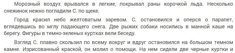 Саша превращается в С., который мало напоминает того человека, кем был совсем недавно. У С., в отличие от разбитого Саши, поначалу даже нет чувств, нет даже жалости к себе. Он состоит наполовину из страдания (которое тоже «с.»), наполовину — из алкоголя, который вливает в себя вместо утреннего чая. Алкоголь явно не лучшего качества, ведь Саша — студент. Зато страдания отборные — непонимание, кипящая ненависть, смех от бессилия, страх одиночества и поиск надежды, разговоры с призраком прошлого, разговоры с внутренним голосом...