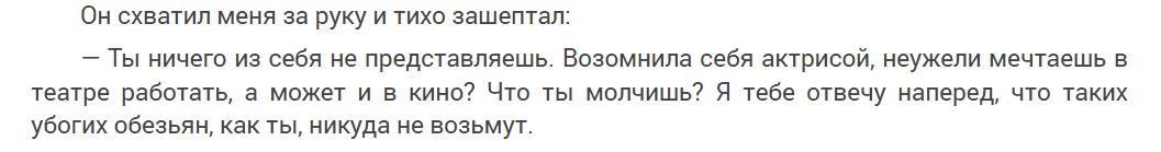 Впечатление от романа неоднозначное. С одной стороны, порадовало то, что героиня серьёзно относится к любви, у неё достаточно твёрдые моральные принципы. Местами интересно описан процесс обучения в творческом ВУЗе, затронут вопрос театральных интриг. Неплохо раскрыта тема дружбы, хотя прощать неоднократные предательства Наташи, на мой взгляд, вряд ли стоило. С другой – в книге явный перебор обрушивающихся на героиню несчастий, а главная любовная линия выглядит не очень убедительно – возможно, из-за того, что герой проявляет интерес к девушке весьма нетрадиционно: толкает её так, что она падает с лестницы, бьёт по голове туфлей и всячески оскорбляет, например, так: