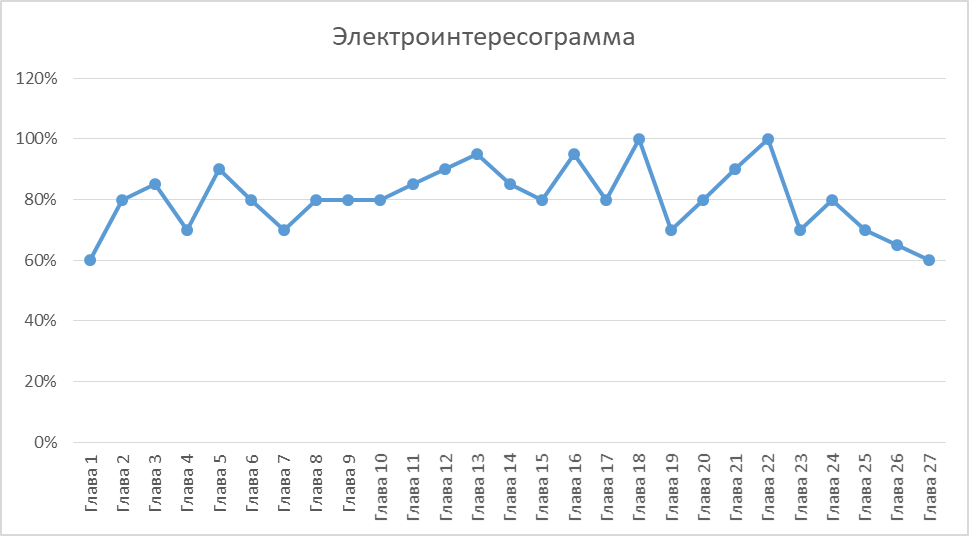 Здесь сложнее. Ниже я приведу график с кривой интереса к сюжету и можно будет более детально проследить, как он менялся, в каких местах стоит подшаманить, но в целом читается интересно, цепляет почти сразу. В глаза поначалу бросается обилие сюжетных штампов - но ровно до тех пор, пока не осознаёшь, что это откровенно стёбные моменты, и дальше всё идёт как по маслу. Есть несколько мест, где сюжет ощутимо провисает (см. график).