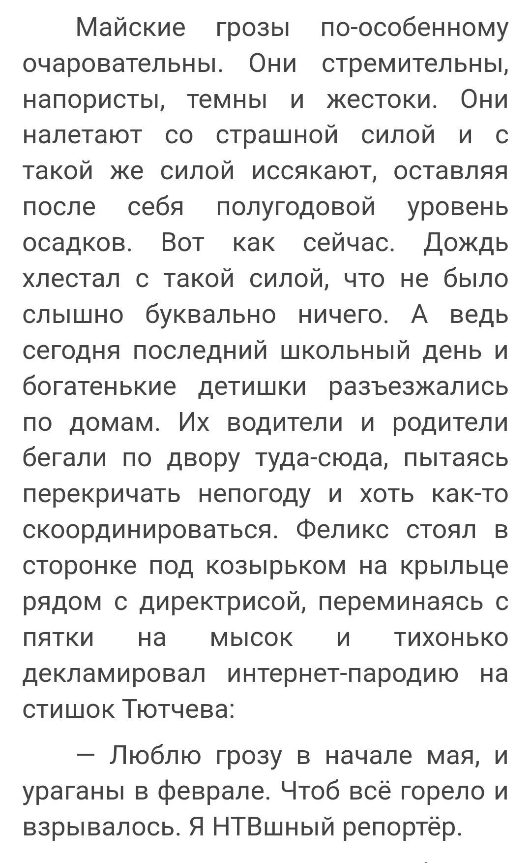 Атмосфера момента через погоду. Приём не новый, но использован очень хорошо! Действительно погружает, перенастраивает. И сами описания прекрасны!