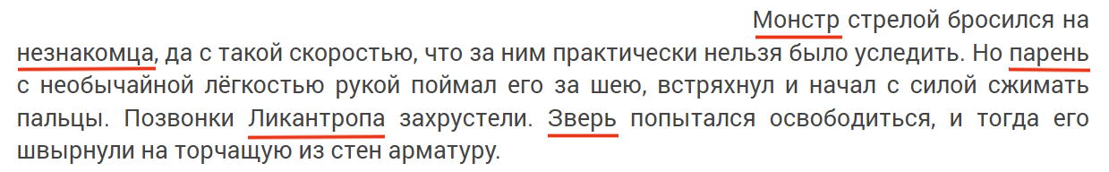Упоминаются: монстр, незнакомец, парень, Ликантроп и зверь. Сколько всего персонажей задействовано? Правильно, двое. Спасибо, хоть догадаться можно.
