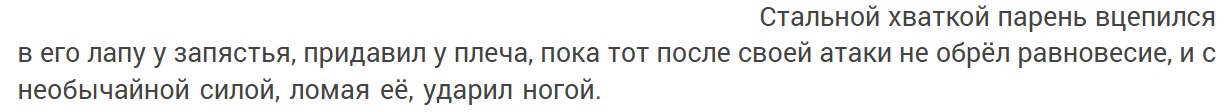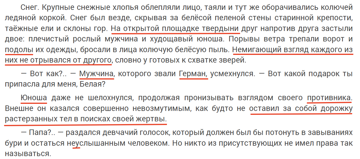 Далее я запутался, кто там от кого не отрывался немигающим взглядом. Мужчина – Герман – парень – противник. Хрен без стакана разберешь, тем более оба вскорости обратились в нелюдей. Я как-то привык думать, что парень – это тоже мужчина, а кто кому противник, еще не въехал, едва приступив к чтению.