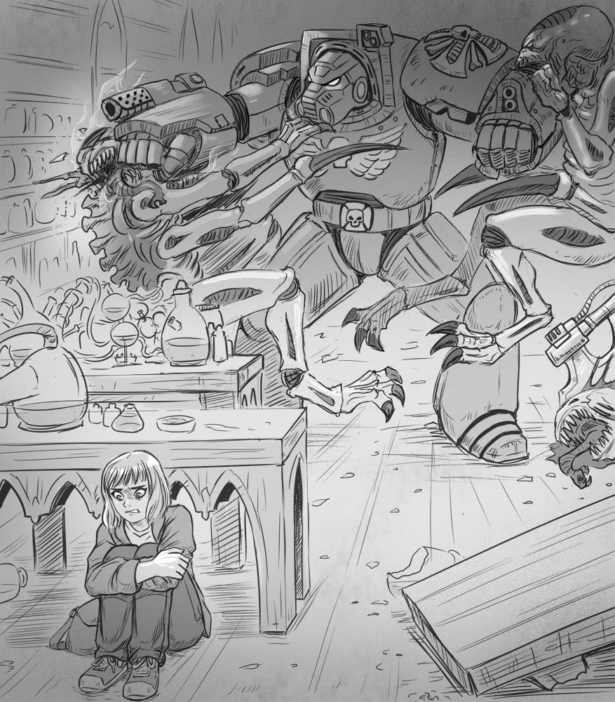 Впрочем, один небольшой кусочек паззла выпадает из неё. Да-да, речь идет о тварюшках с иллюстрации Флика. Ну а что поделать, тираниды на момент повествования ещё не открыты, такие дела.